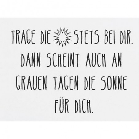 Ce porte bonheur ensoleillera le cœur de son destinataire. Protégé par une petite pochette de coton portant l'inscription "you are my sunshine", vous trouverez un soleil doré, peint sur un disque de porcelaine. Un petit message touchant, écrit en anglais d'un côté et en allemand de l'autre, indique : " Emporte toujours ce soleil avec toi pour que même les jours gris soient ensoleillés ". Ce message saura motiver vos amis proches en toutes circonstances !