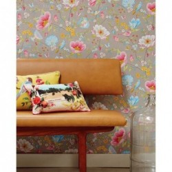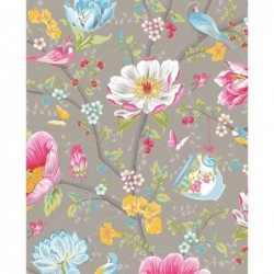 Un papier peint de la signature Pip Studio, gris avec des motifs de magnolias en fleurs, d'oiseaux et de tasses à thé en suspension, pour un intérieur féerique. Facile à accrocher LavableCollection 2014 Dimensions : 10m x 0,52m Livraison environ 7 jours Collection : Pip Studio Wallpaper