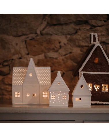 Une féerique et merveilleuse petite maison Räder en forme de maison en pain d'épices. Une fois allumée, sa matière, la porcelaine biscuit diffusera une lumière douce et feutrée qui mettra en valeur les motifs enchanteurs de la façade. Un objet qui apporte un petit côté fantastique et magique à votre intérieur, et qui fera la joie des enfants.