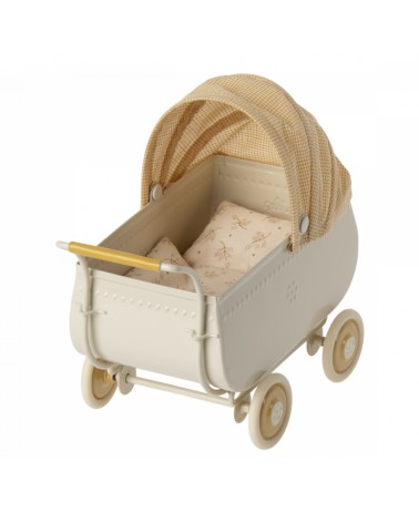Ce très joli landau Maileg en en métal avec des décors bosselés. Parfait pour la sieste au parc !