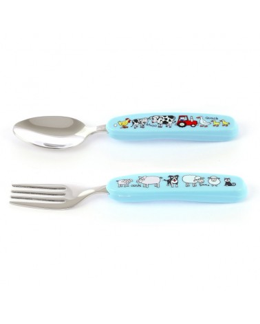 Un petit set de 2 couverts pour apprendre à manger en avec beaucoup de facilité et en s'amusant ! Les poignées se prennent bien en main. La petite boîte est pratique pour emporter les couverts en pique nique.