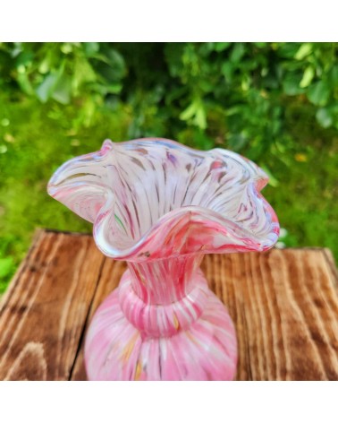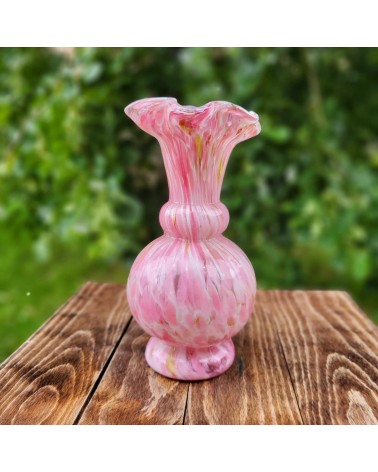 Vase boule sur piédouche, à col bulbeux ondulé, à fond bigarré rose.