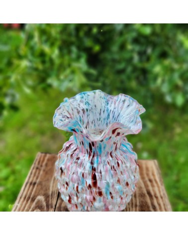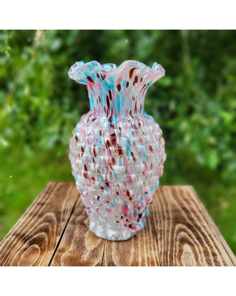 Joli vase ovoïde à col collerette. Les magnifiques couleurs rose-bleu-blanc à fond bigarré ont conservé tout leur éclat. Le tout sur un décor moulé de tressagelui donnant un petit effet côtelé.