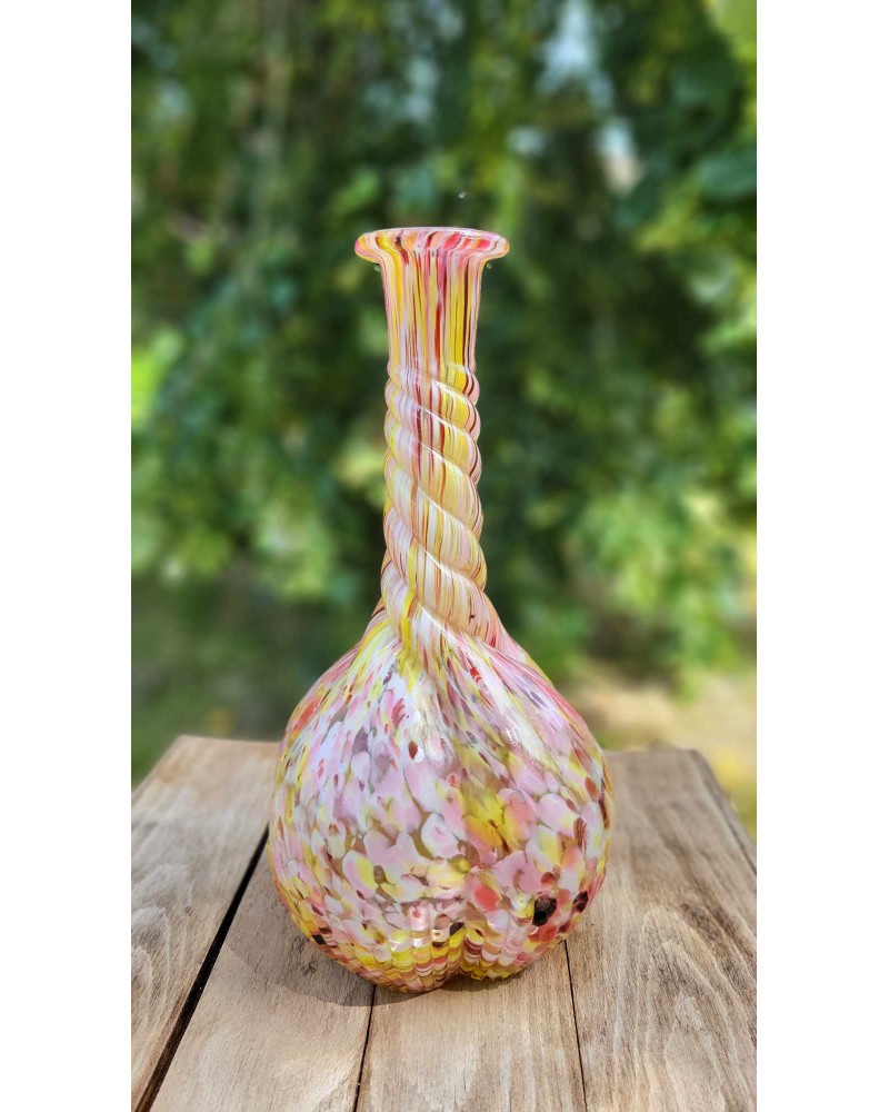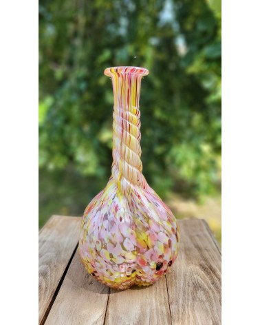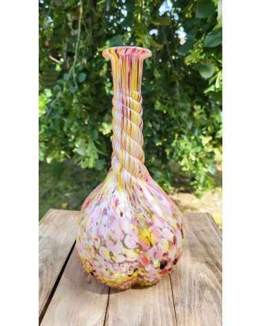 Joli vase en forme de carafe boule. Les magnifiques couleurs rose-jaune mouchetées de marron à fond bigarré ont conservé tout leur éclat. Le tout sur un décor moulé de tressage.