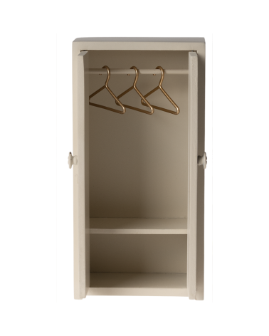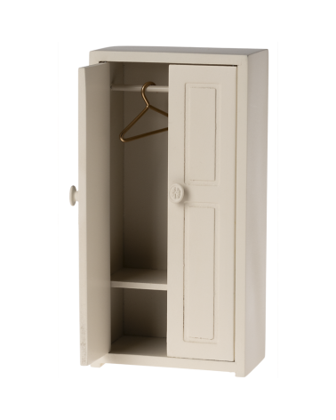 Cette très belle armoire Maileg pour les petites souris est décorée de jolies moulures anciennes. Cette armoire peut s'insérer dans la maison de poupée Maileg. Livrée avec 3 cintres.