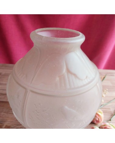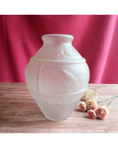 Vase "balustre" en verre moulé pressé décoré en relief par des oiseaux volatiles. A placer à la lumière pour obtenir un très bel effet.