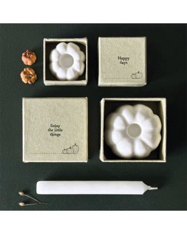Un craquant petit bougeoir citrouille en porcelaine, d'un blanc immaculé, pour faire entrer un peu de nature et de lumière dans votre maison. Chez Eglantine, nous aimons tout ce qui peut nous ramener au potager ! C'est tellement féerique ! Le bougeoir est présenté dans une petite boite cartonnée qui porte l'inscription "Happy Days", pour ajouter la petite touche de joie qu'il faut !
