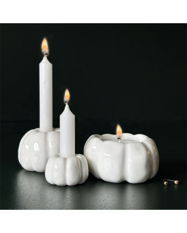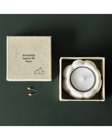 Un craquant petit photophore citrouille en porcelaine, d'un blanc immaculé, pour faire entrer un peu de nature et de lumière dans votre maison. Chez Eglantine, nous aimons tout ce qui peut nous ramener aux citrouilles ! C'est tellement féerique ! Le bougeoir est présenté dans une petite boite cartonnée qui porte l'inscription "Frienship warms the heart" (L'amitié réchauffe le coeur), pour offrir à votre meilleur(e) ami(e)
