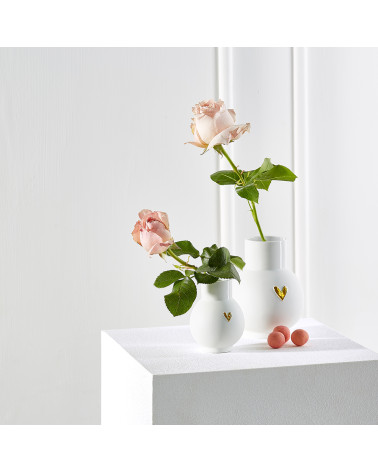 Un vase Rader en porcelaine blanche sobre, rond et élégant, fabriqué par la maison allemande de décoration Räder qui crée des objets épurés, aux décors minimalistes et fascinants. Ce vase en porcelaine mate, non émaillée sur l'extérieur, mais émaillée à l'intérieur, permet de mettre en valeur de jolies fleurs d'hiver, mais il se suffit à lui-même également. Son décor de petit coeur en relief est tellement attendrissant.
