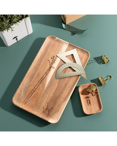 Ce ravissant plateau signé Rader est en bois d'hévéa non traité. Gravé d'une grande échelle en haut de laquelle un personnage entouré de fleurs arrose de jeunes plants, il évoque la pluie nourricière, la fraîcheur, la beauté du jardin ressourçant. Sur une table, sur un buffet, une table basse, il apportera une touche naturelle et chaleureuse à votre intérieur.
