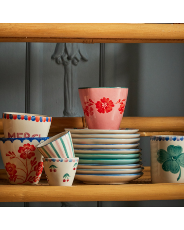 Avec leurs motifs peints à la main — fleurs éclatantes, cerises croquantes, rayures festives et adorables messages comme "LOVE" ou "CHERRY" — chaque tasse raconte une histoire pleine de douceur et de fantaisie. Les couleurs tendres et vives se mêlent harmonieusement pour transformer chaque pause café ou thé en un véritable moment de plaisir.