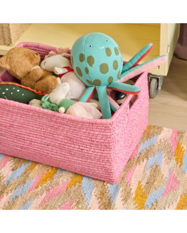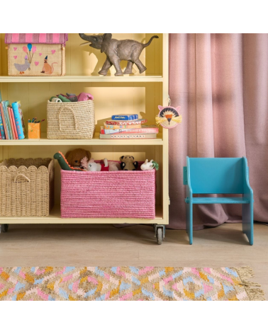 Préparez-vous à faire danser vos orteils sur ce tapis joyeusement décalé, un vrai cocktail de couleurs vintage et de bonne humeur. Avec ses motifs géométriques façon kaléidoscope et ses teintes chatoyantes – rose peps, bleu ciel, doré épicé et beige soleil – il transforme votre couloir, entrée ou coin lecture en terrain de jeu bohème.