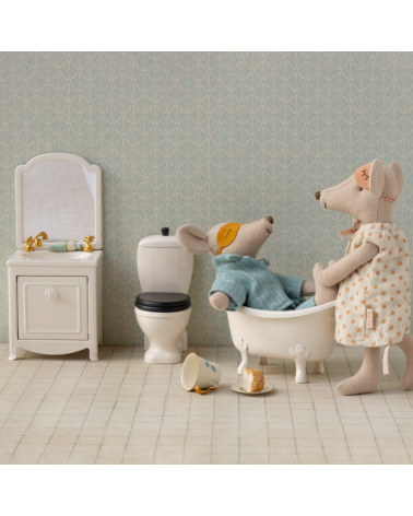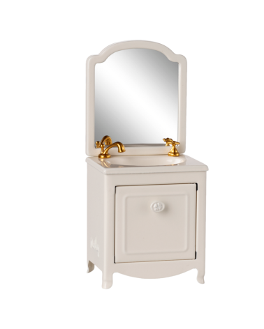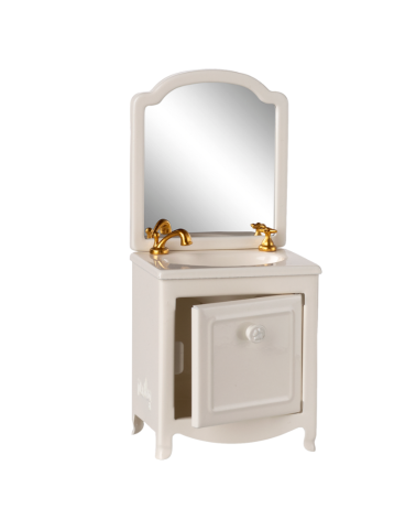 Ce petit meuble de salle de bain Maileg est parfait pour une jolie salle de bain de souris. Il contient un placard, un évier et un miroir. Les petites souris seront heureuses de pouvoir se faire belle avec cet élégant petit meuble !