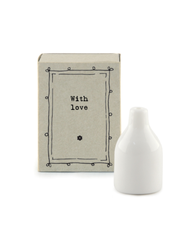 Offrez un petit geste plein de délicatesse avec ce mini vase en céramique blanc, présenté dans une élégante boîte kraft ornée de l’inscription « With love ». Compact et raffiné (4,5 x 3 cm), il est idéal pour accueillir une fleur séchée ou un petit brin de verdure. Son format miniature en fait une attention parfaite pour un cadeau symbolique, un souvenir de mariage, un remerciement ou simplement pour transmettre un message tendre.