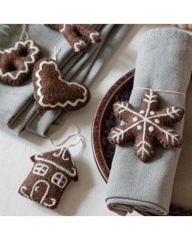 Un adorable petit flocon de pain d'épices en laine bouillie pour créer un petit monde gourmand et magique dans votre maison ! A marier avec d'autres éléments de la gamme pour se plonger dans un univers féerique, enchanté et merveilleux ! Fait à la main et décoré d'un fil blanc délicat, il apportera un coté rassurant et réconfortant à votre décoration d'hiver.