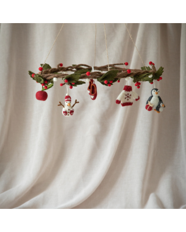 Sous les lumières douces de l’hiver, cette couronne suspendue en feutrine invite la magie des fêtes dans votre maison. Ornée de feuilles de houx vertes et de baies rouges et blanches, elle évoque les traditions d’antan, où chaque décoration portait une promesse de chaleur et de convivialité.