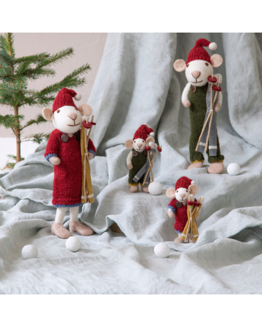 À la lisière des contes et des légendes, apparaît cette petite souris blanche, façonnée en feutrine douce avec un soin artisanal. Coiffée de son bonnet à pompon et habillé d'une salopette chaude et confortable, elle semble prête à aller jouer dans la nature scintillante de neige de l'hiver.