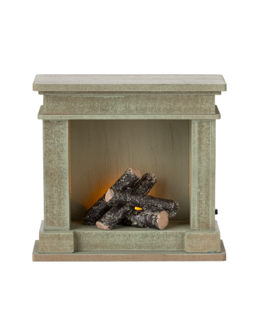 Peinte dans un élégant vert patiné, elle recrée l’ambiance réconfortante d’un foyer ancien. À l’intérieur, de véritables mini-bûches en bois apportent une touche de réalisme irrésistible. Parfaite pour décorer un salon miniature ou une maison Maileg, cette cheminée est une pièce phare pour les longues soirées d’hiver pleines de douceur et d’imagination.
