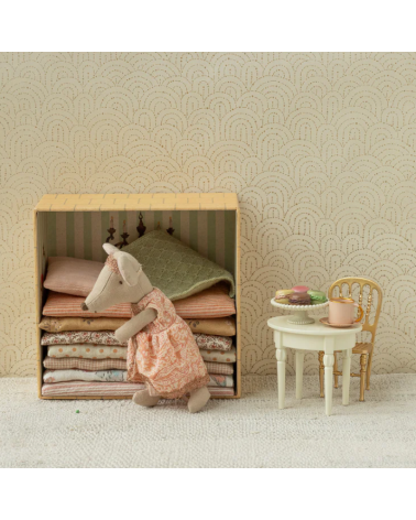 Cette élégante table de chevet en bois peint Maileg est parfaite pour un intérieur sobre et élégant chez les souris ! Elle se glisse parfaitement dans le château, mais aussi dans n'importe quelle maison Maileg ! Avec son design inspiré des tables romantiques anciennes, elle ajoute une touche d’authenticité et de raffinement à l’univers miniature Maileg. Solide et détaillée, elle est parfaitement adaptée à l’échelle des meubles et personnages Maileg.