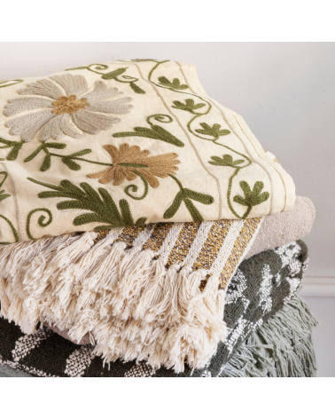 Apportez une touche d’authenticité et de douceur à votre intérieur avec ce magnifique plaid brodé Madam Stoltz. Confectionné en coton de qualité, il séduit par ses motifs floraux raffinés aux nuances naturelles de beige, vert olive et brun doré, qui évoquent la nature et le charme artisanal. 🌿