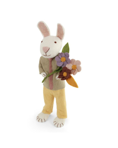 Laissez-vous séduire par ce magnifique lapin en laine feutrée, une pièce d'exception qui apporte une présence poétique et chaleureuse à votre intérieur. Vêtu de son élégante chemise olive, d'une cravate soignée et de son pantalon moutarde, ce grand compagnon tient avec tendresse un généreux bouquet de fleurs printanières. Chaque détail, de ses longues oreilles rosées à ses petites pattes brodées, témoigne d'un savoir-faire unique et d'une attention méticuleuse portée aux finitions.