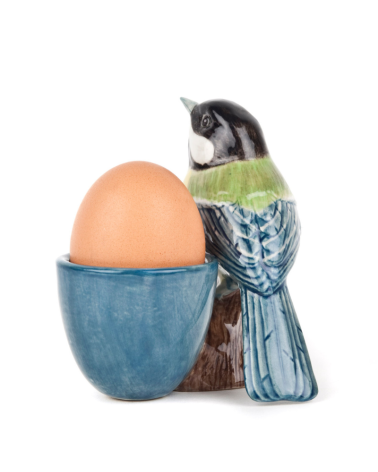 À ses côtés, le coquetier en céramique émaillée, dans un bleu délicatement patiné, accueille parfaitement votre œuf à la coque. Son contraste harmonieux avec les tons naturels de la mésange crée un ensemble raffiné et plein de caractère.